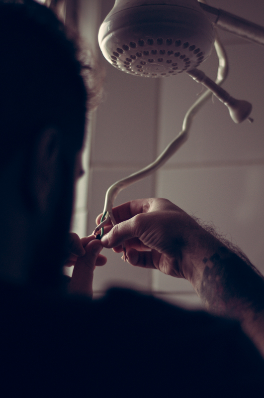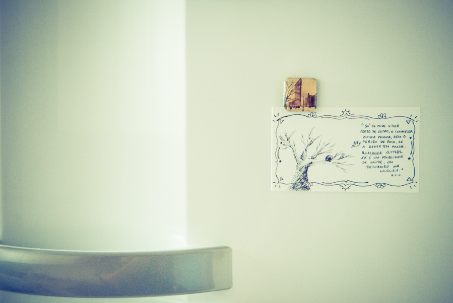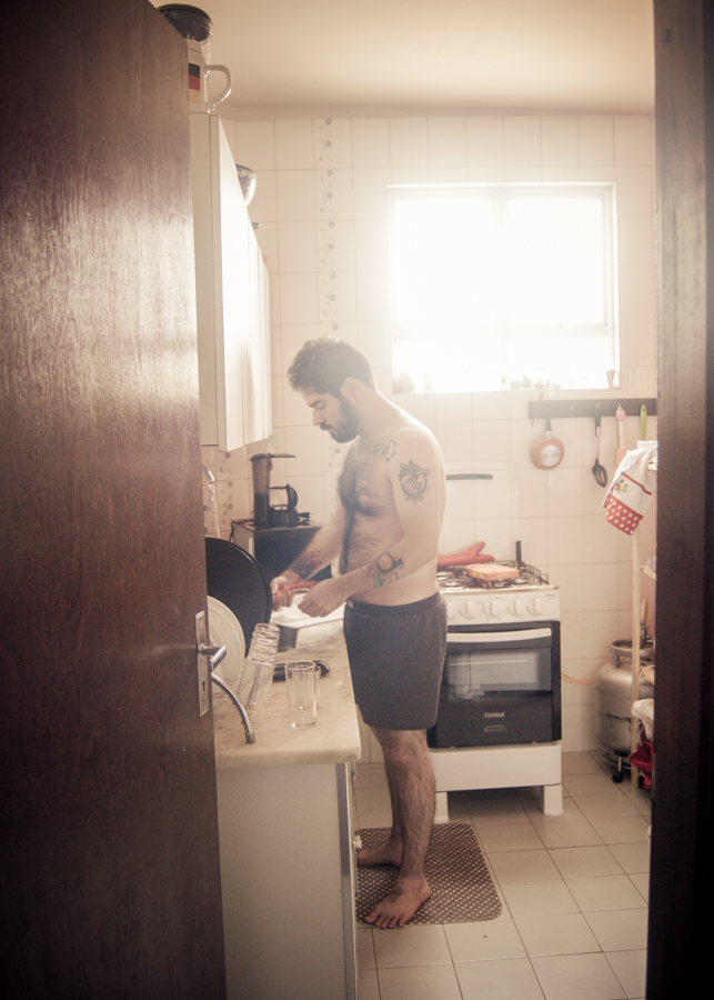 “Dizem por aí que o primeiro ano de casados é o pior. Quando fiquei sabendo disso, achei curioso, pois sempre pensei que fosse o contrário. Acho que a gente acaba acreditando na ideia de que relacionamentos seguem uma ordem fixa, que começam emocionantes e vão ficando mornos com o tempo. Talvez essa desconfiança com as coisas que duram venha da mesma inquietação que nos convence da necessidade de trocar de celular todos os anos. Como se o amor também ficasse obsoleto, como se perdesse com o tempo o valor de revenda. Mas parece então que dizem por aí que o primeiro ano é o pior. Não necessariamente ruim, mas pior do que os outros. Que fica mais fácil. Que, com o cuidado de tentar consertar as coisas quebradas ao invés de substituí-las, o tempo desgasta apenas as pontas afiadas que às vezes usamos para nos proteger da terrível vulnerabilidade que é estar junto. Fotografar esse começo é uma forma de buscar e resgatar a beleza que se esconde todos os dias atrás da pilha de roupas sujas, da louça para lavar, da lâmpada queimada, das contas a pagar. E de registrar esse processo, às vezes doloroso, de conhecer a si mesmo através do outro, de aprender a crescer junto, de construir juntos um refúgio amoroso onde o coração possa descansar depois de mais um dia nesse mundo doido.”